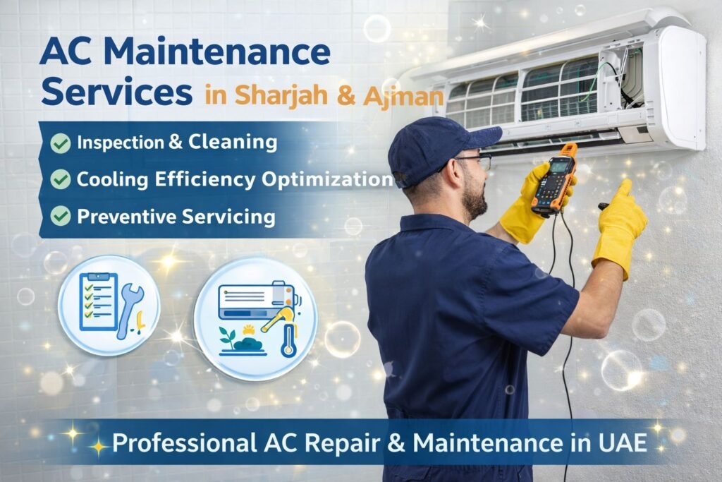 AC maintenance in Sharjah and Ajman includes filter cleaning, coil cleaning, duct inspection, refrigerant level check, thermostat testing, and full system inspection to ensure efficient cooling.